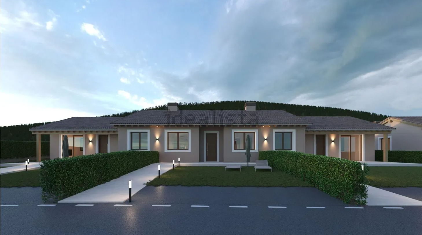 Consta de un total de seis chalets pareados, de una sola planta distribuidos en dos bloques de tres chalets, cada propiedad dispondrá de tres dormitorios, cocina office, salón, dos baños, jardín privado y espacio para parking propio.
